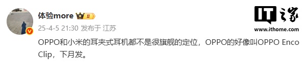 本站 4 月 5 日消息,博主@体验more 今日爆料称,OPPO 和小米的耳夹式耳机都不是“很旗舰”的定位,OPPO 的好像叫 OPPO Enco Clip,下月发。