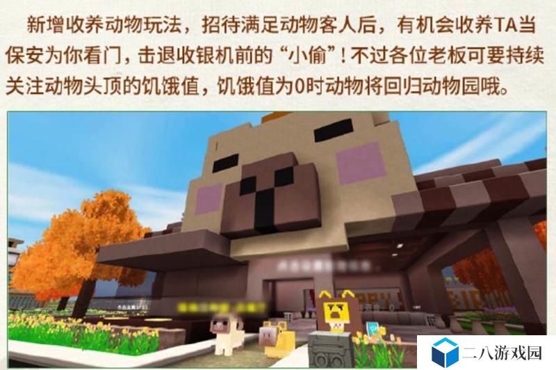 新增收养动物玩法,招待满足动物客人后,有机会收养TA当保安为你看门,击退收银机前的“小愉”!不过各位老板可要持续关注动物头顶的饥饿值,饥饿值为0时动物将回归动物园哦。