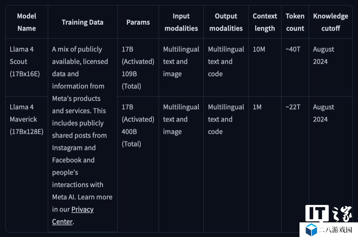 本站 4 月 6 日消息,Meta现已发布旗下最新Llama 4 系列AI 模型,包含 Llama 4 Scout、Llama 4 Maverick 和Llama 4 Behemoth,Meta 透露相应模型都经过了“大量未标注的文本、图像和视频数据”的训练,以使它们具备“广泛的视觉理解能力”。