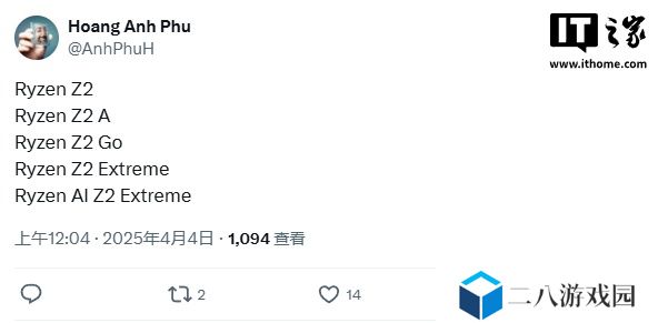 本站 4 月 5 日消息,AMD 今年 1 月在 CES 2025 上发布了三款面向掌机市场的 Z2 处理器,而 @AnhPhuH 昨日爆料称 AMD 将再推出两款新型号 ——Z2 A 和 AI Z2 Extreme。
