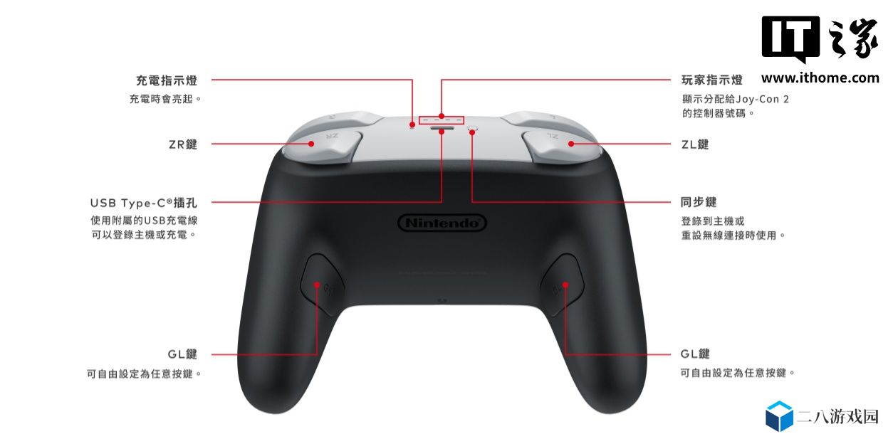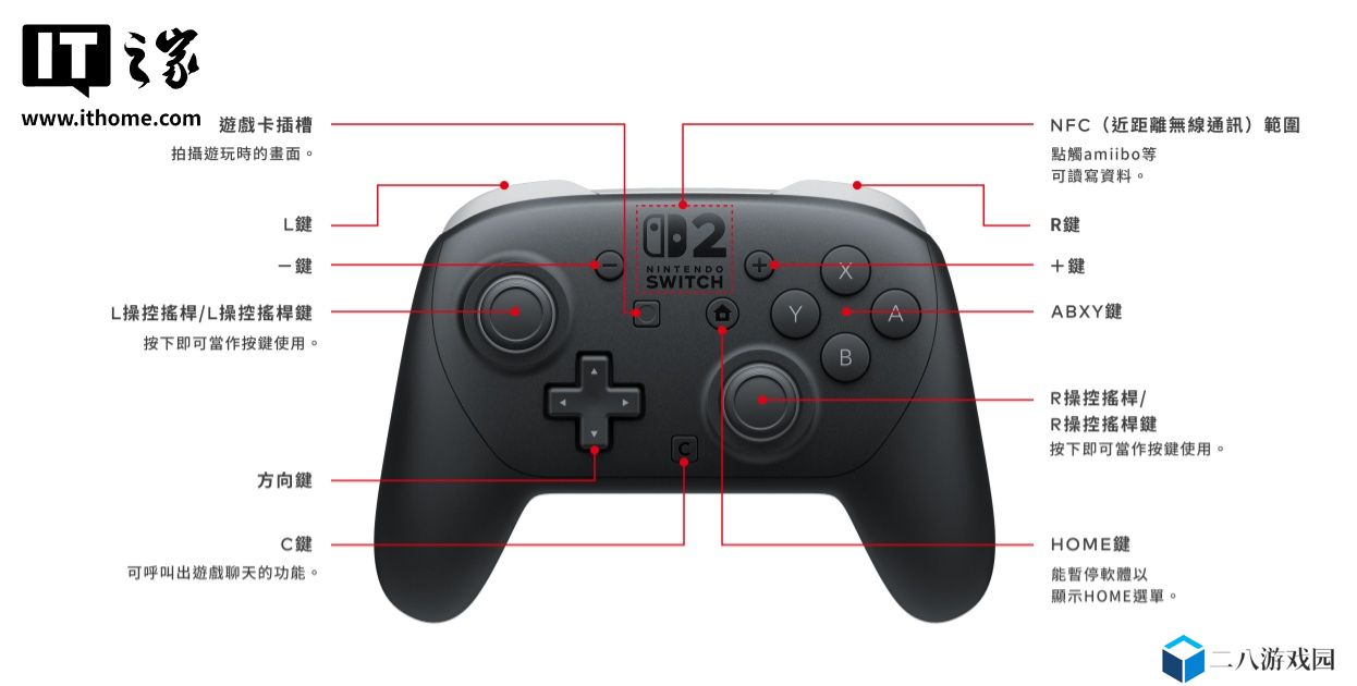本站 4 月 5 日消息,在 4 月 2 日举行的任天堂Switch 2发布会上,官方公布了 Switch 2 的新款Pro手柄,主要增加背键、3.5mm音频接口和C键。