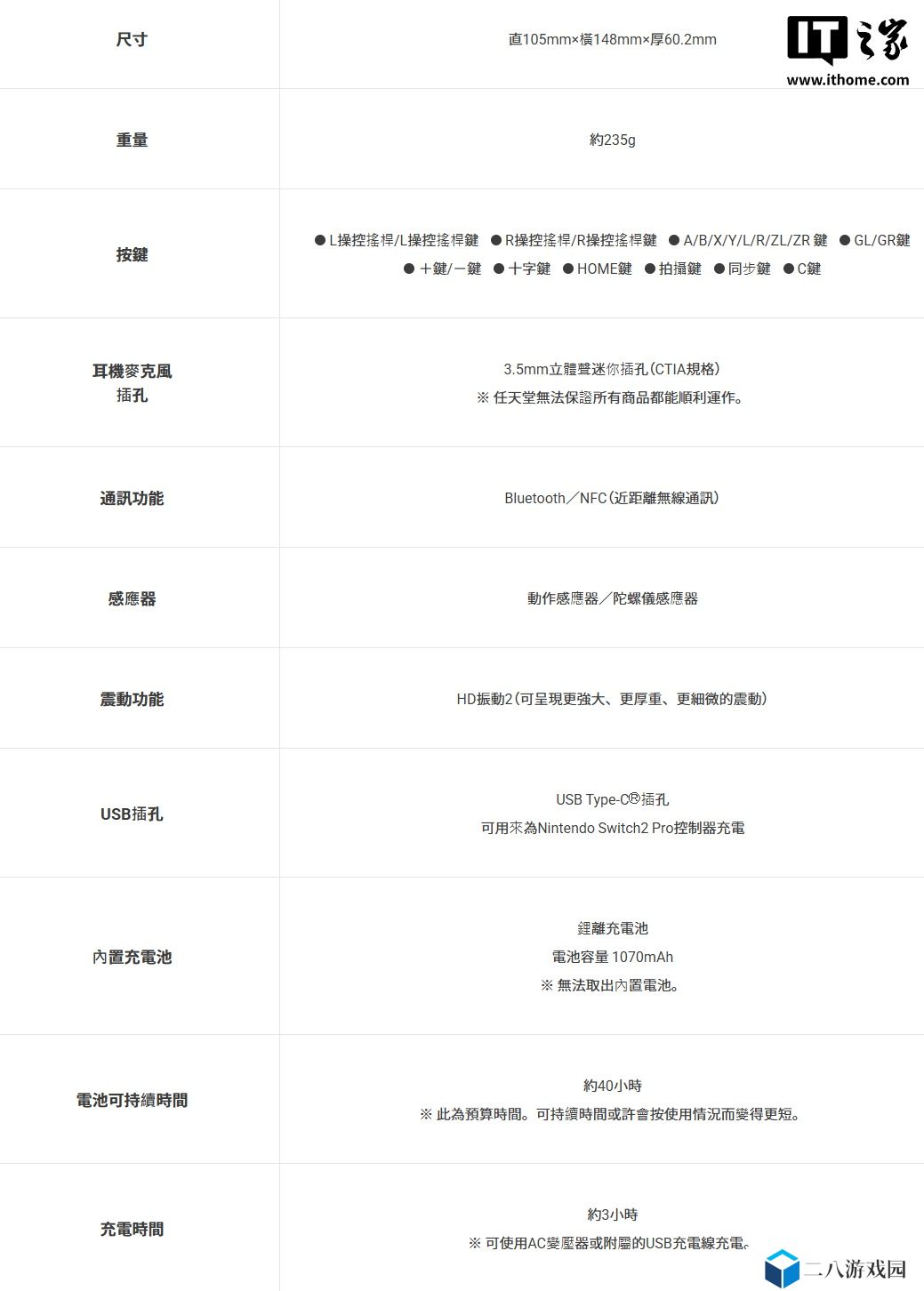 任天堂 Switch 2 全新 Pro 手柄完整规格公布:续航仍为约 40 小时,充电时间缩短 3 小时
