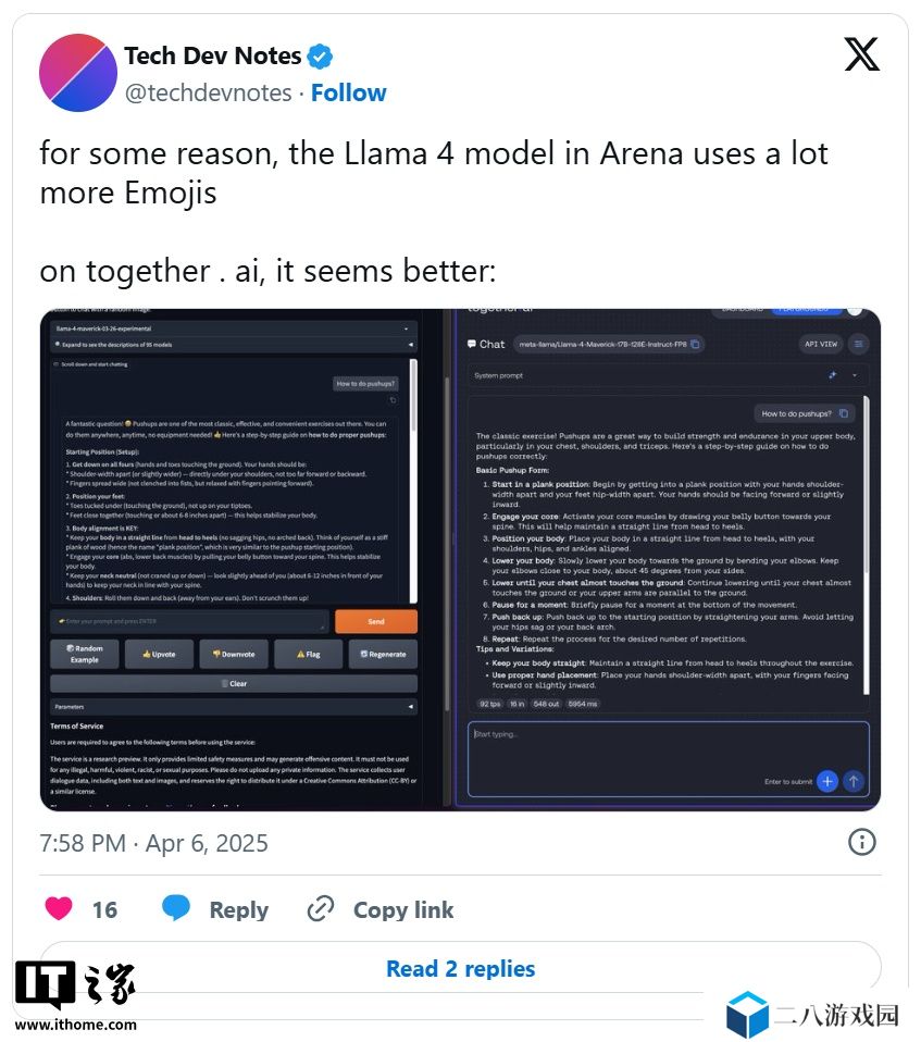 事实上,研究人员在 X 上已经观察到了公开可下载的 Maverick 版本与 LM Arena 上托管的模型之间存在显著的行为差异。例如,LM Arena 版本似乎更倾向于使用大量的表情符号,并且给出的答案往往冗长且拖沓。