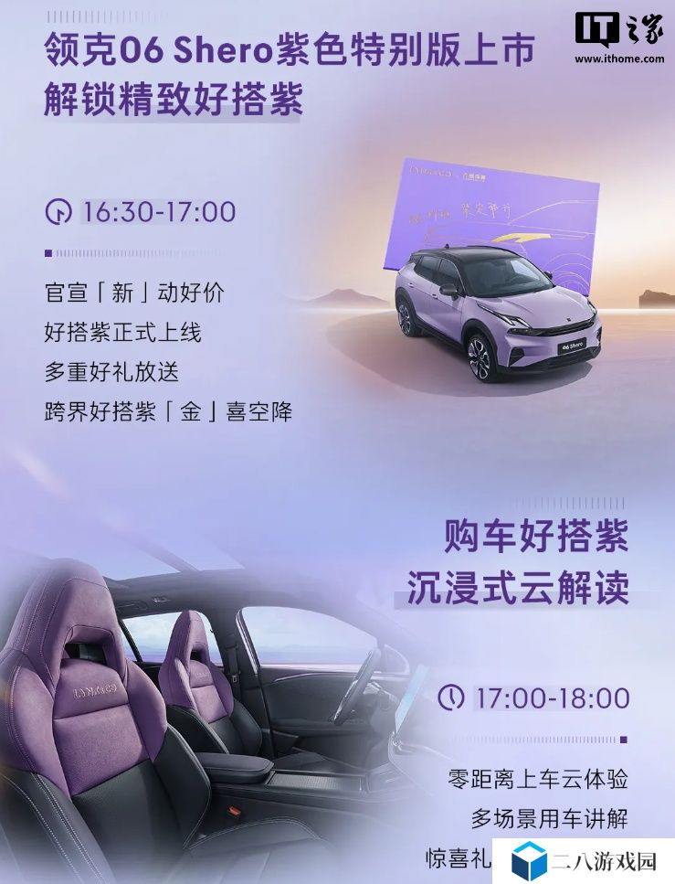 根据规划,领克 06 Shero 紫色特别版汽车将在 16:30-17:00 官宣价格。
