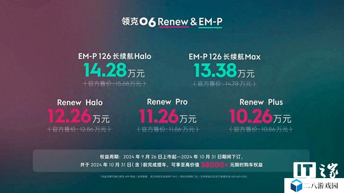 新款领克 06 家族于 2024 年 9 月上市,包括搭载 1.5T 汽油发动机的领克 06 Renew,共有三种配置,官方指导价为 10.86 万元至 12.86 万元;以及搭载 1.5 升插电混合动力系统的领克 06 EM-P,共有两种配置,官方指导价分别为 14.78 万元和 15.68 万元。